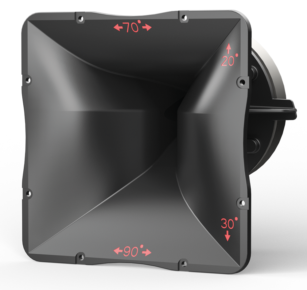 Conversely, at the bottom the opening angle widens out to cover the front of the audience seamlessly. In addition to this, a slight downward angle has been incorporated into the waveguide design to direct more of the high-frequency content down into the audience and not upwards into the surrounding walls and ceiling.